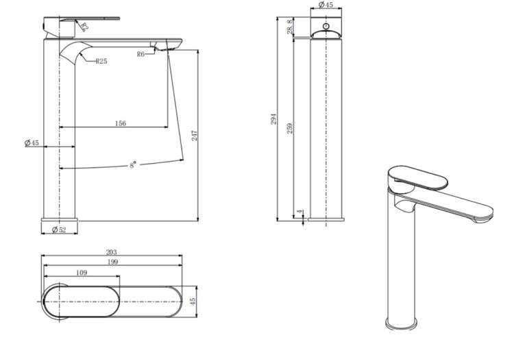 • Вынос излива, мм 156